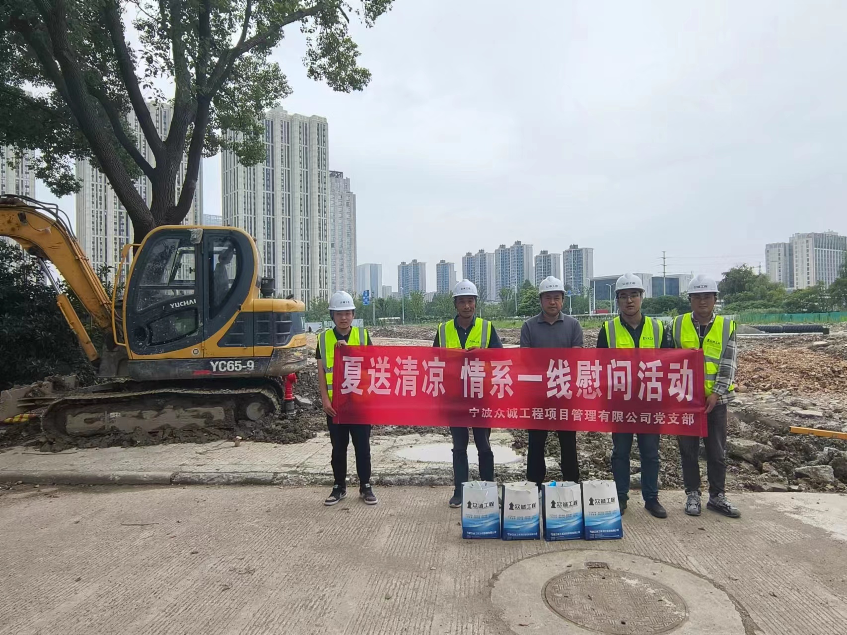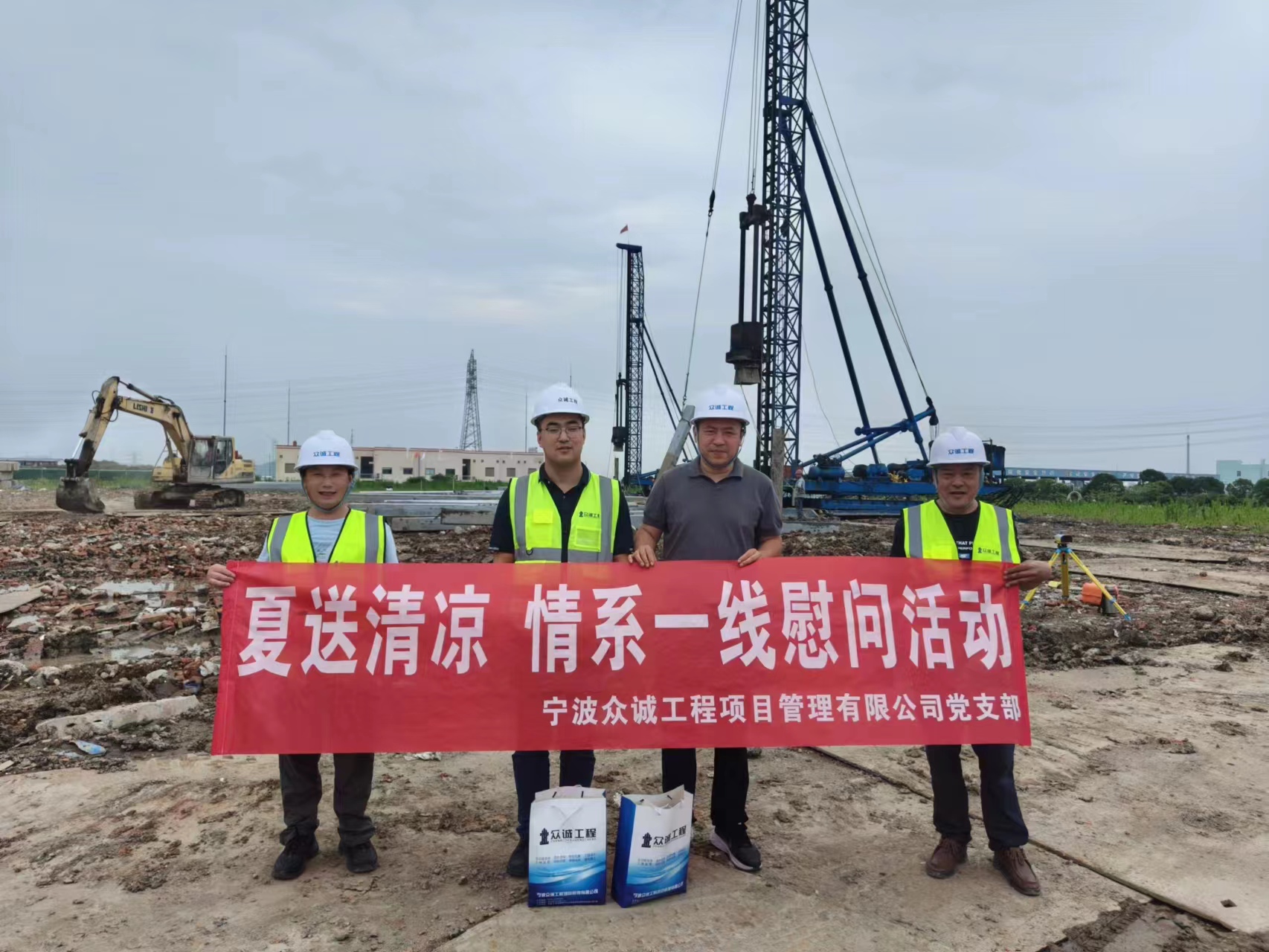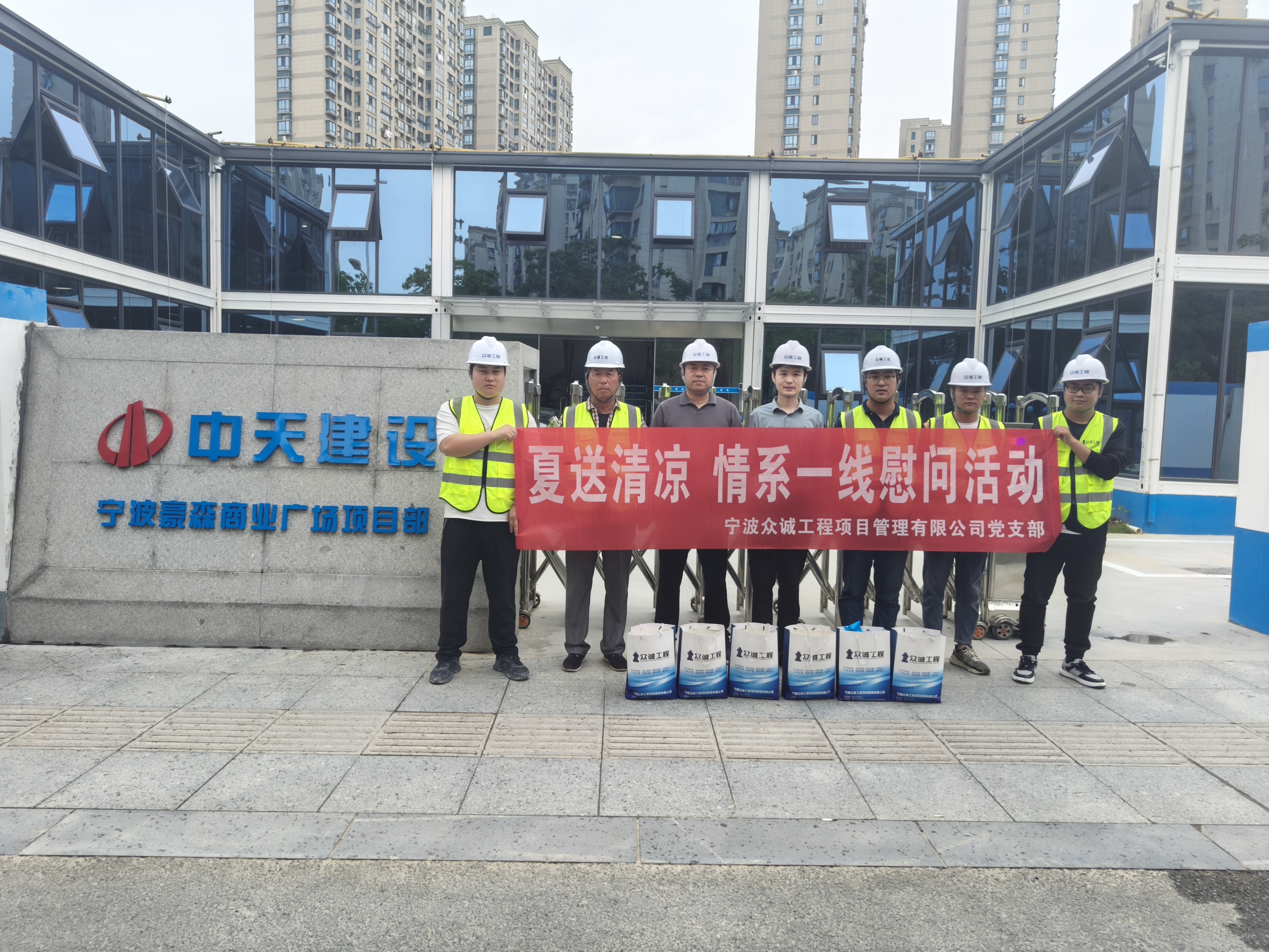2023年7月1日,炎炎夏日,心系工程项目一线同事,关爱一线同事健康和安全,宁波众诚公司党支部书记陈力来到在建工程项目部进行慰问。