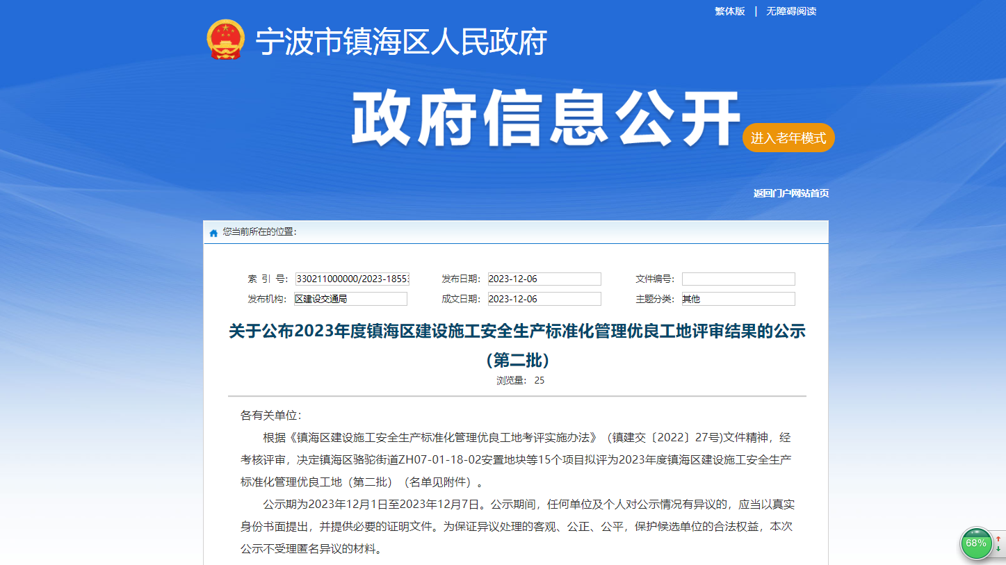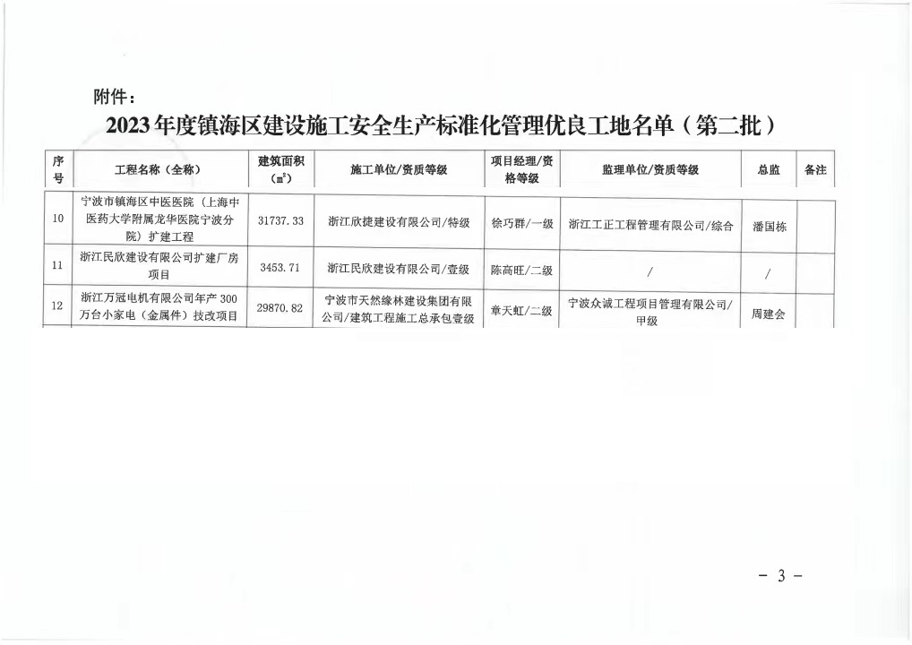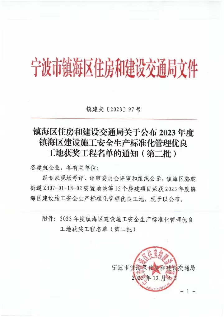 12月5日,宁波市镇海区住房和城乡建设交通局发布《关于公布2023年度镇海区建设施工安全生产标准化管理优良工地获奖工程》文件通知,由我众诚工程公司监理的浙江万冠电机有限公司年产300万台小家电整机(金属件)技改项目获得“2023年度建筑施工安全生产标准化工地”荣誉称号。