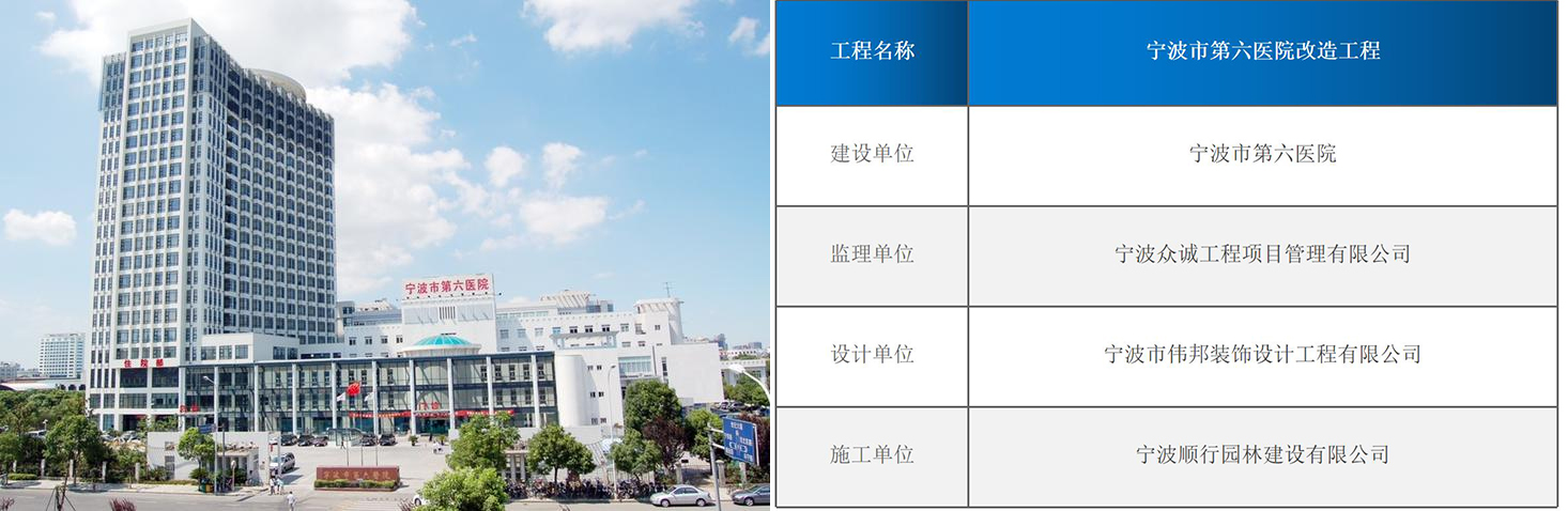 宁波市第六院改造工程位于宁波市鄞州区第六医院内,其中住院大楼6-21层住院部、办公室、走廊进行门窗、墙面改造装修以及诊室分隔,门诊楼诊室,体检中心,B超室等进行整体改造装修。总建筑面积约27800平方米。